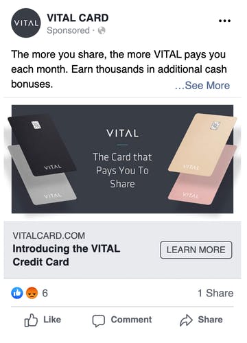 When we were helping VITAL Card with one of the most successful pre-launch campaigns ever, we did lots of experimenting with online ads. Below you’ll see one of the early examples. Not only did we use online ads to test the overall value prop, but we also used it to test demographics and early feature concepts. For example, we had a hypothesis that socially conscious people would want to give a portion of their cashback to charities. The data showed that this feature didn’t attract the same interest as some of our other ideas. For example, targeting sharing economy participants like Uber and Lyft drivers were lucrative and ended up being one of the keys to our success.