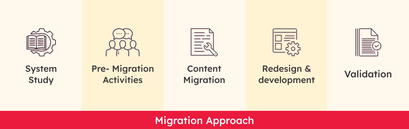 Typically, migration to SharePoint Online follows a four-step approach, beginning with system study that includes requirement validation with business users, UX design finalization, migration strategy, and migration prioritization, then moving onto pre-migration activities that include portal categorization, component redesigning, and staging instance setup.
